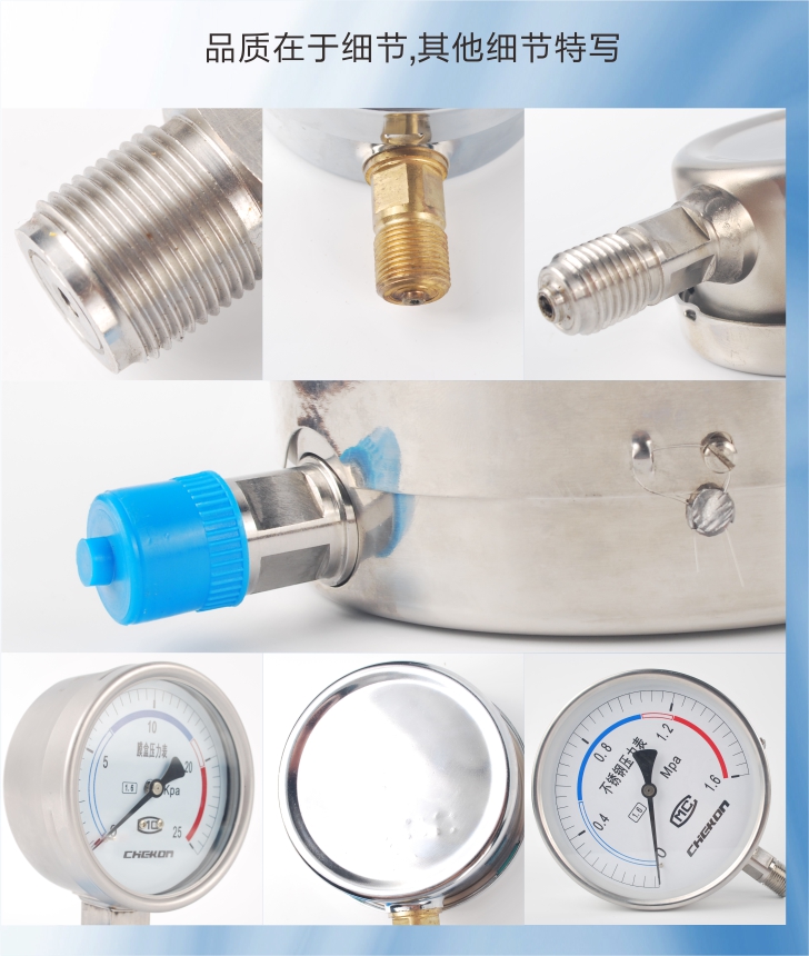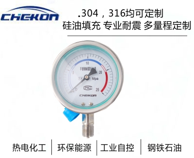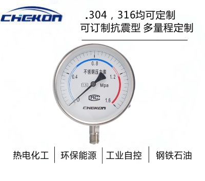 不銹鋼壓力表采用直接接觸式接頭和感壓元件材料,采用icr18Ni9T、Ocr18Ni12Mo2Ti、 sus316,結構為全密封型,具有較強的防被測介質腐蝕和抗環(huán)境腐蝕的能力。不銹鋼壓力表適用于腐蝕性較強的適合不銹鋼元件檢測的介質和惡劣的外部腐蝕環(huán)境中 ,不銹鋼壓力表廣泛應用于石油、化工、冶金等工業(yè)。