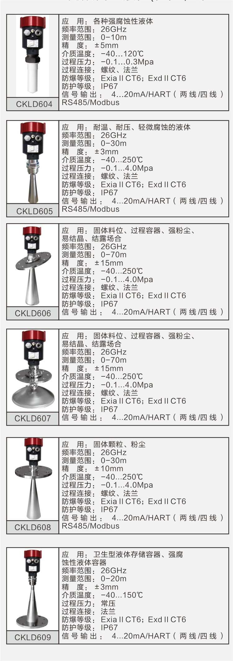 CKLD600系列高頻雷達(dá)物位計(jì)是一款采用脈沖原理非接觸式雷達(dá)物位計(jì),可廣泛應(yīng)用于測量液體、漿料及粘稠物等的距離、物位、體積、重量及明渠流量,也可用于測量粉末、顆粒、塊狀等固體介質(zhì)。即使在多粉塵、有攪拌的應(yīng)用場合中,也可以穩(wěn)定測量。